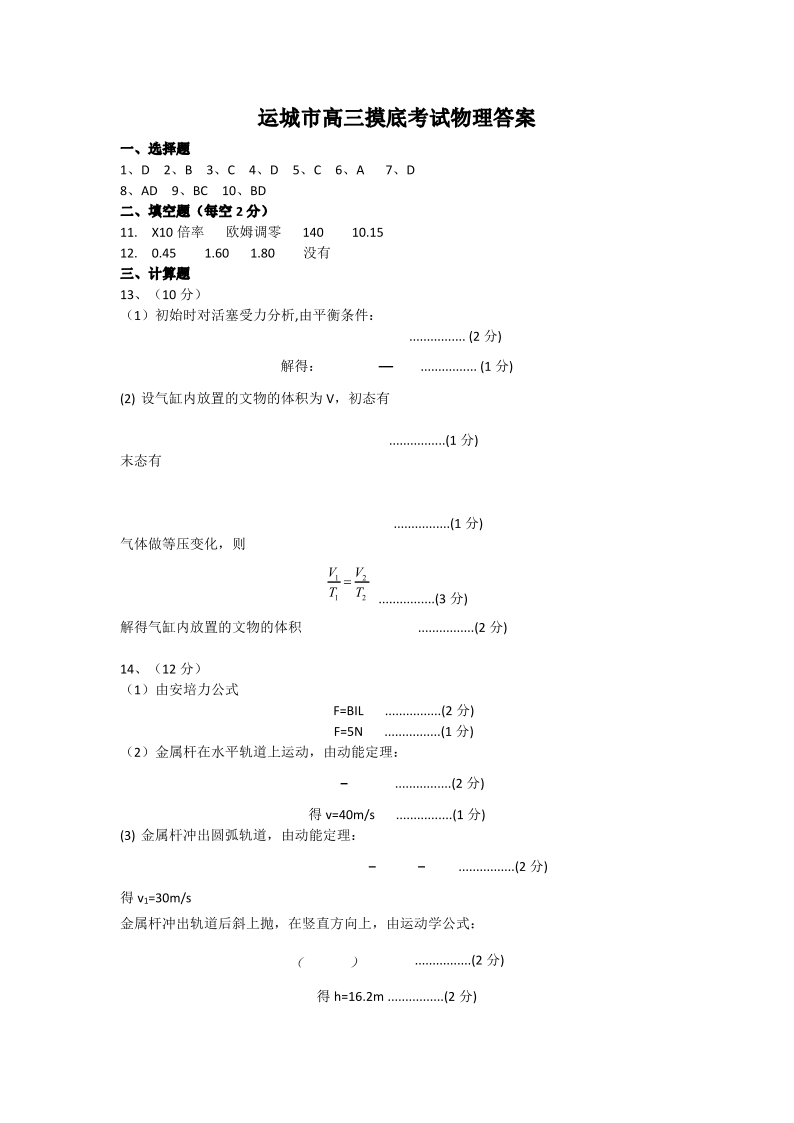 山西省运城市2024-2025学年高三上学期9月摸底调研测试 物理答案