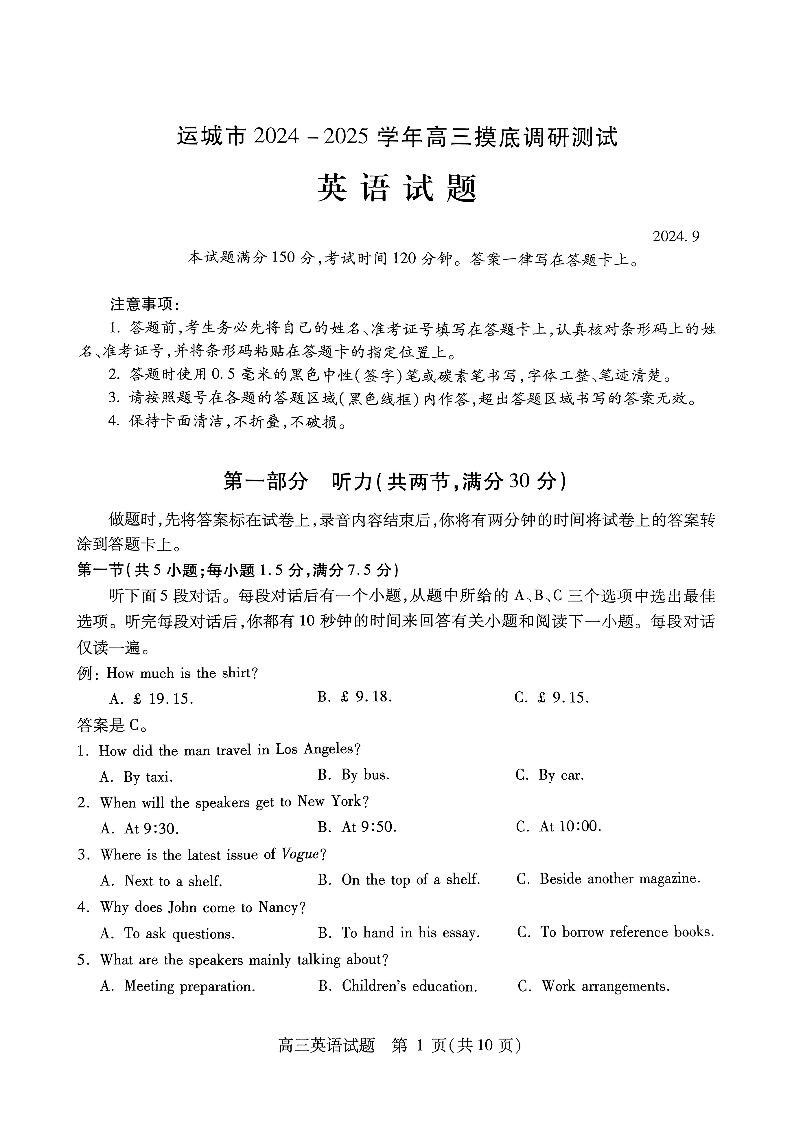 山西省运城市2024-2025学年高三上学期9月摸底调研测试 英语