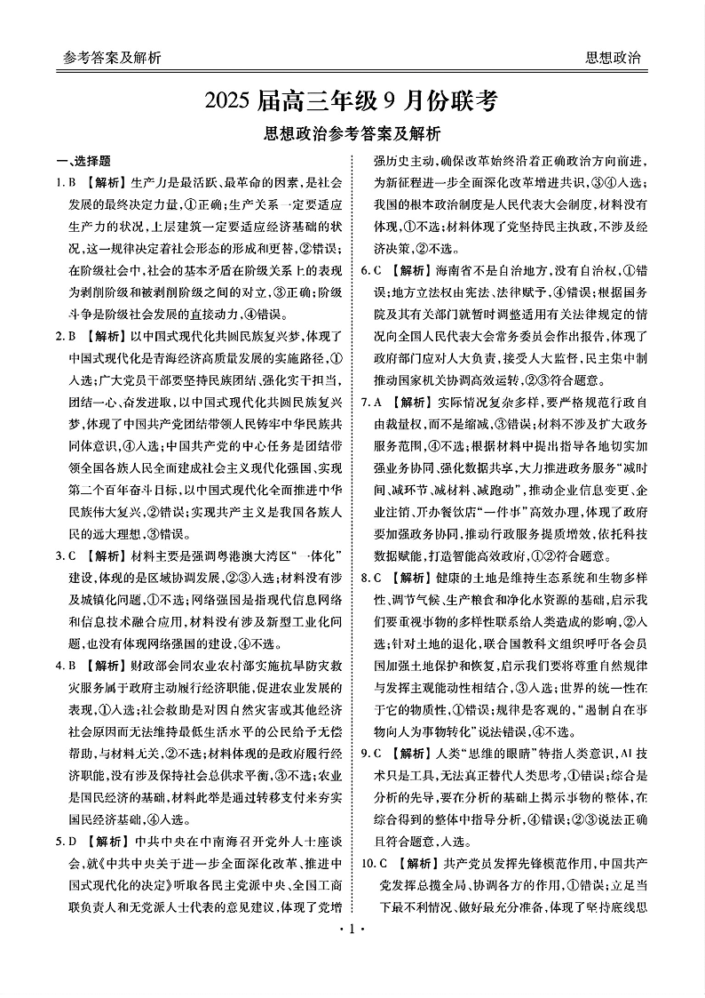 广东省2025届高三年级衡水9月份大联考 政治答案