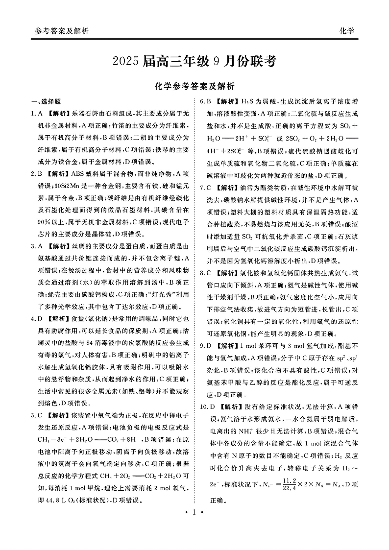 广东省2025届高三年级衡水9月份大联考 化学答案