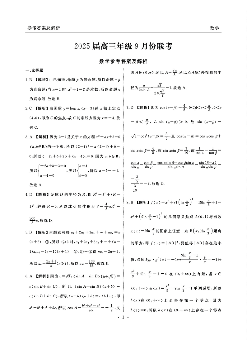 广东省2025届高三年级衡水9月份大联考 数学答案