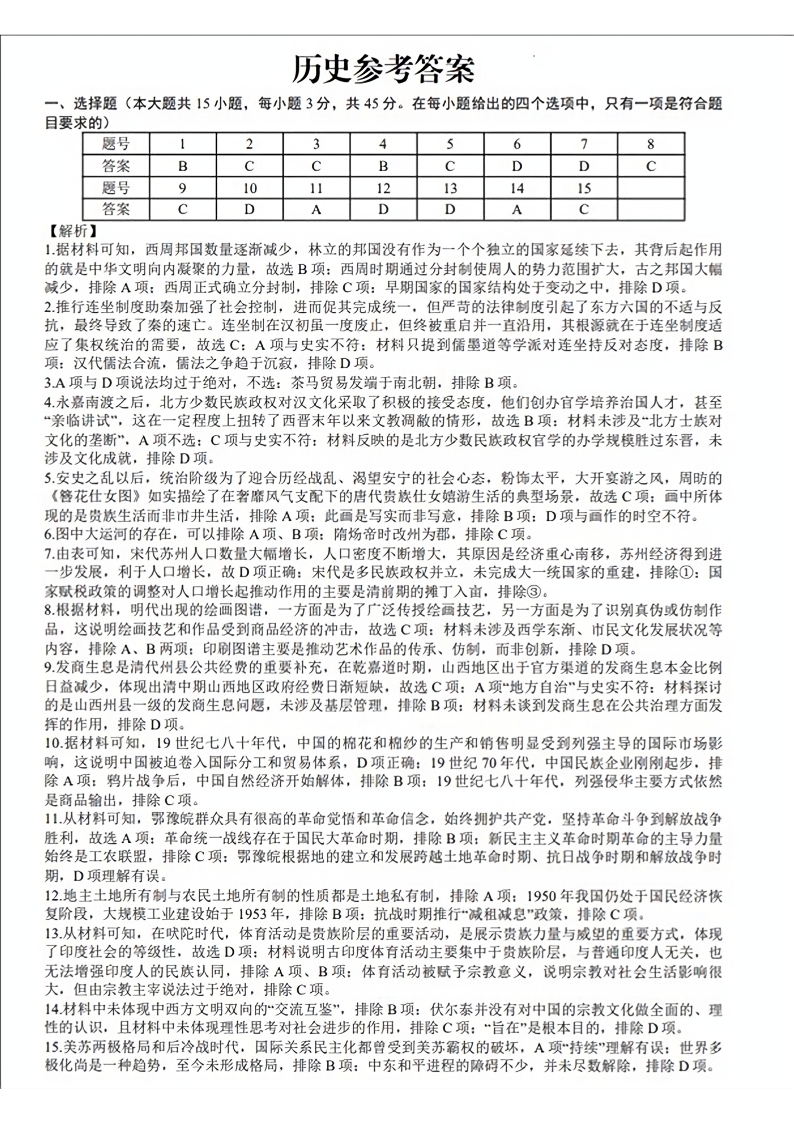 重庆市第八中学2025届高考适应性月考卷(一)历史答案