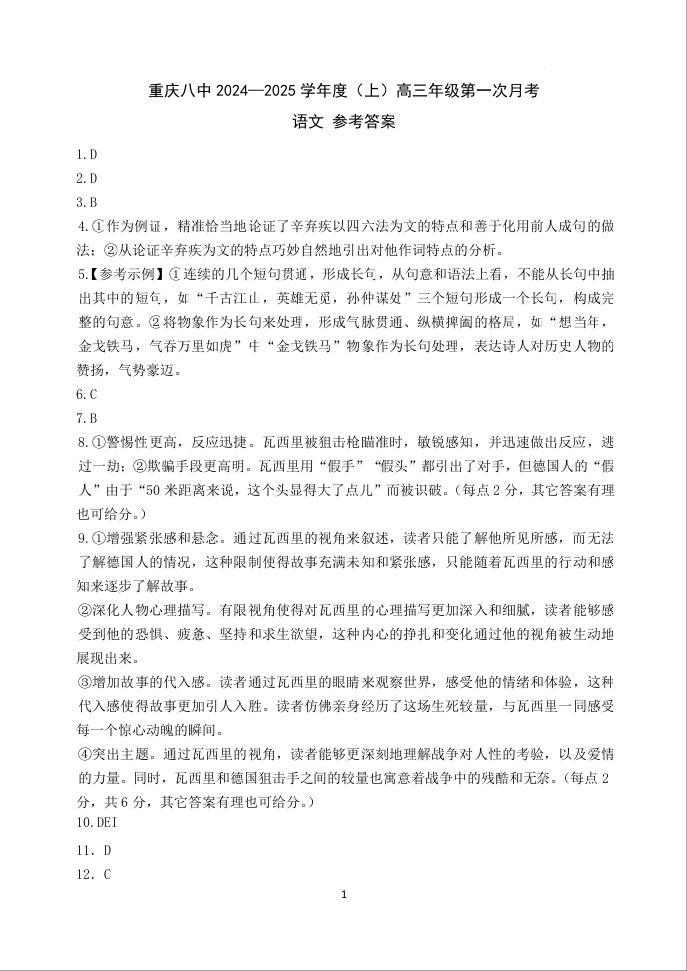重庆市第八中学2025届高考适应性月考卷(一)语文答案