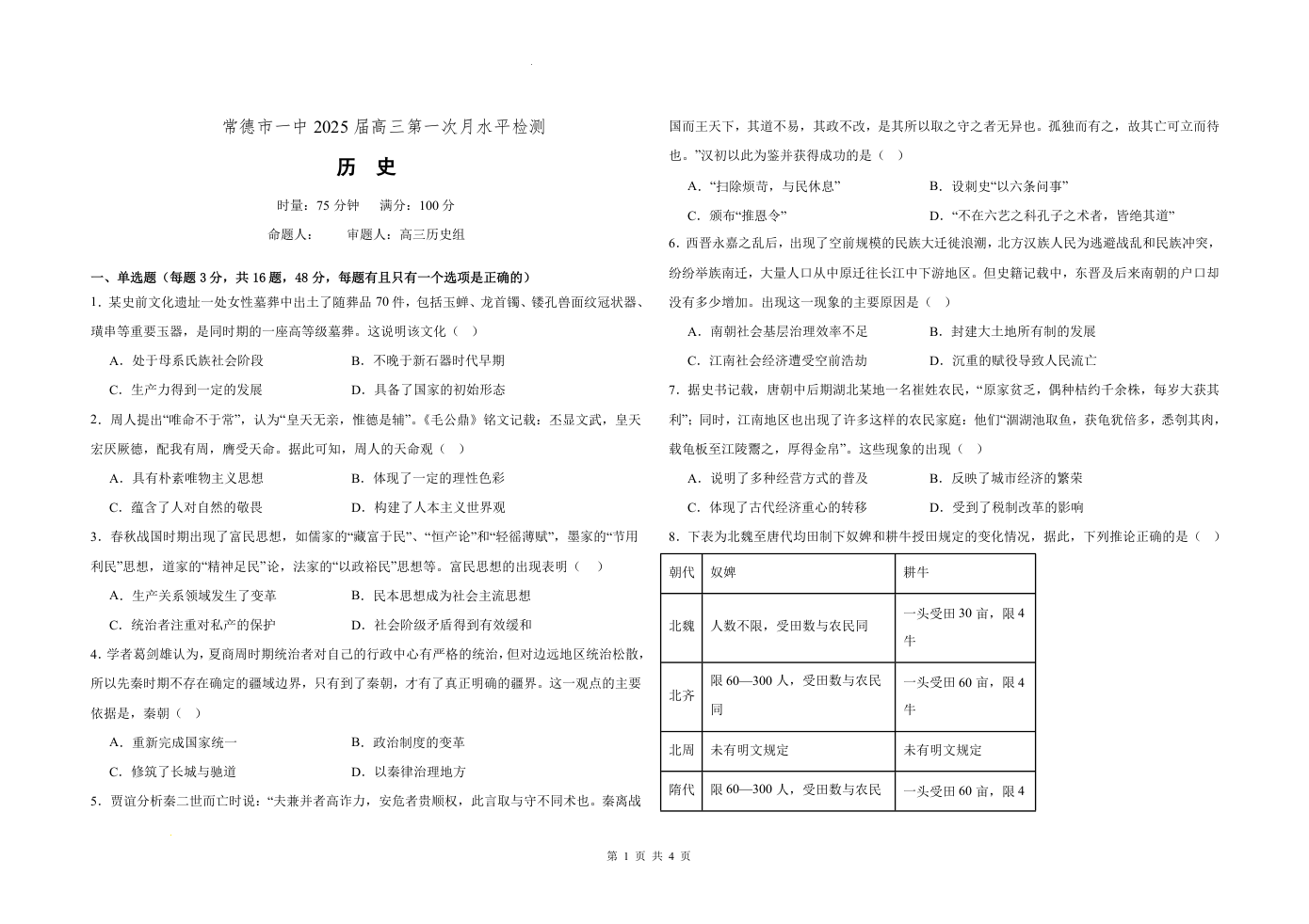 常德市一中2025届高三第一次月水平检测 历史