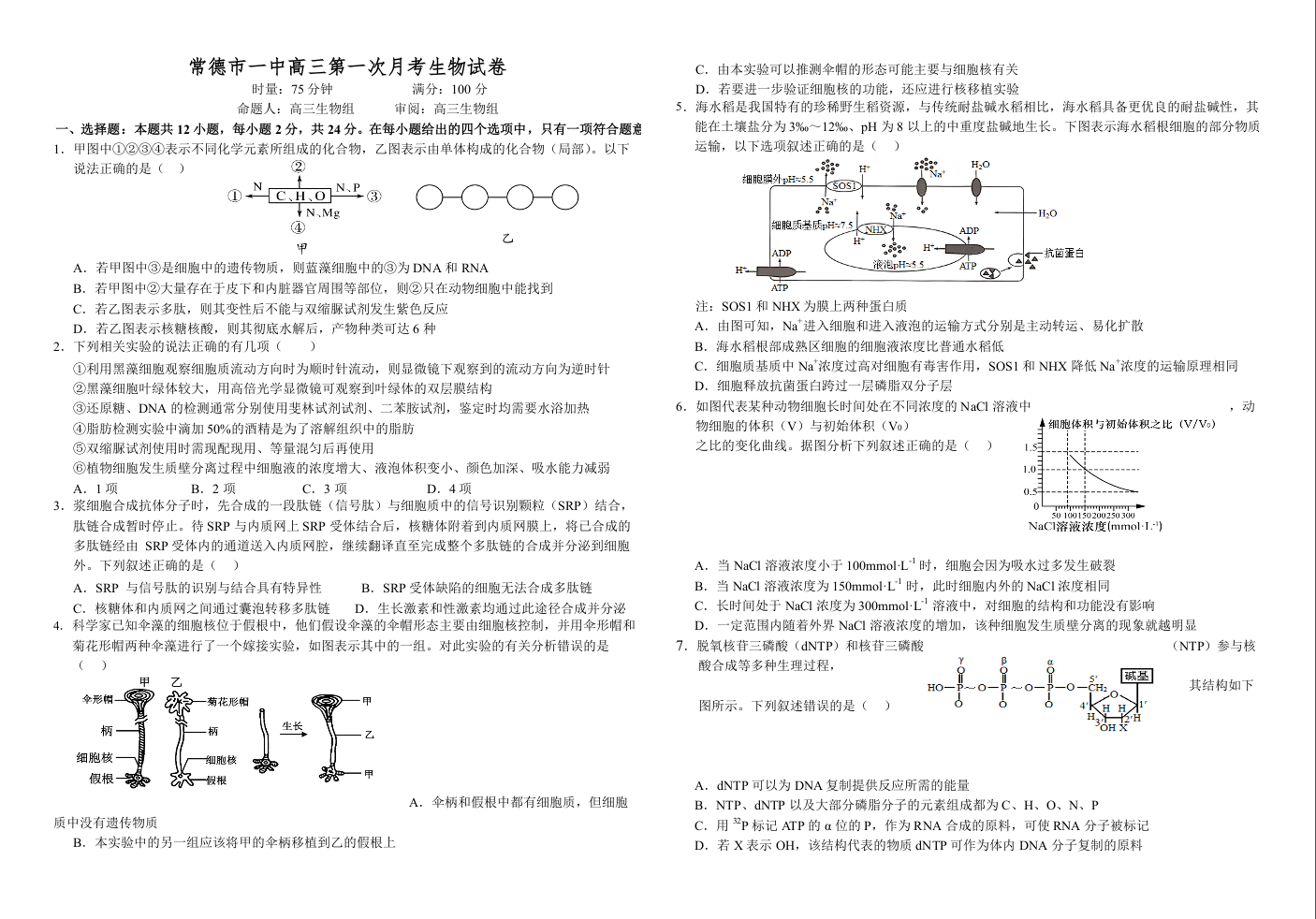 常德市一中2025届高三第一次月水平检测 生物