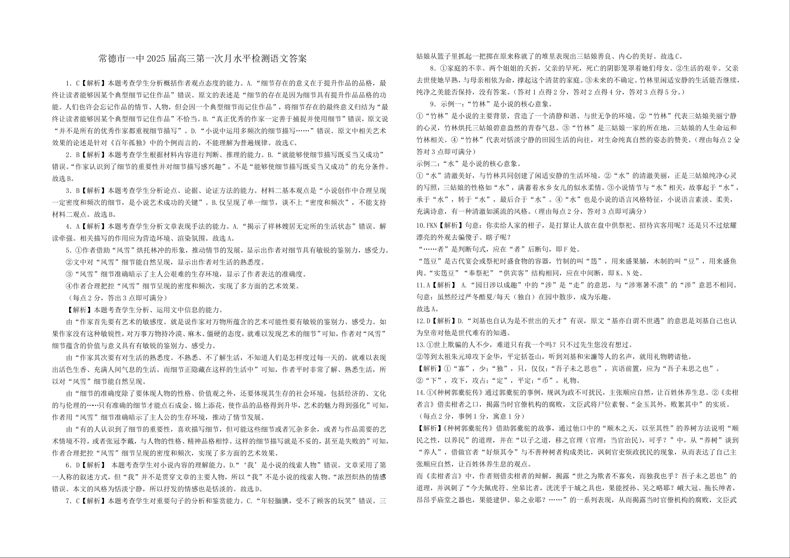 常德市一中2025届高三第一次月水平检测 语文参考答案