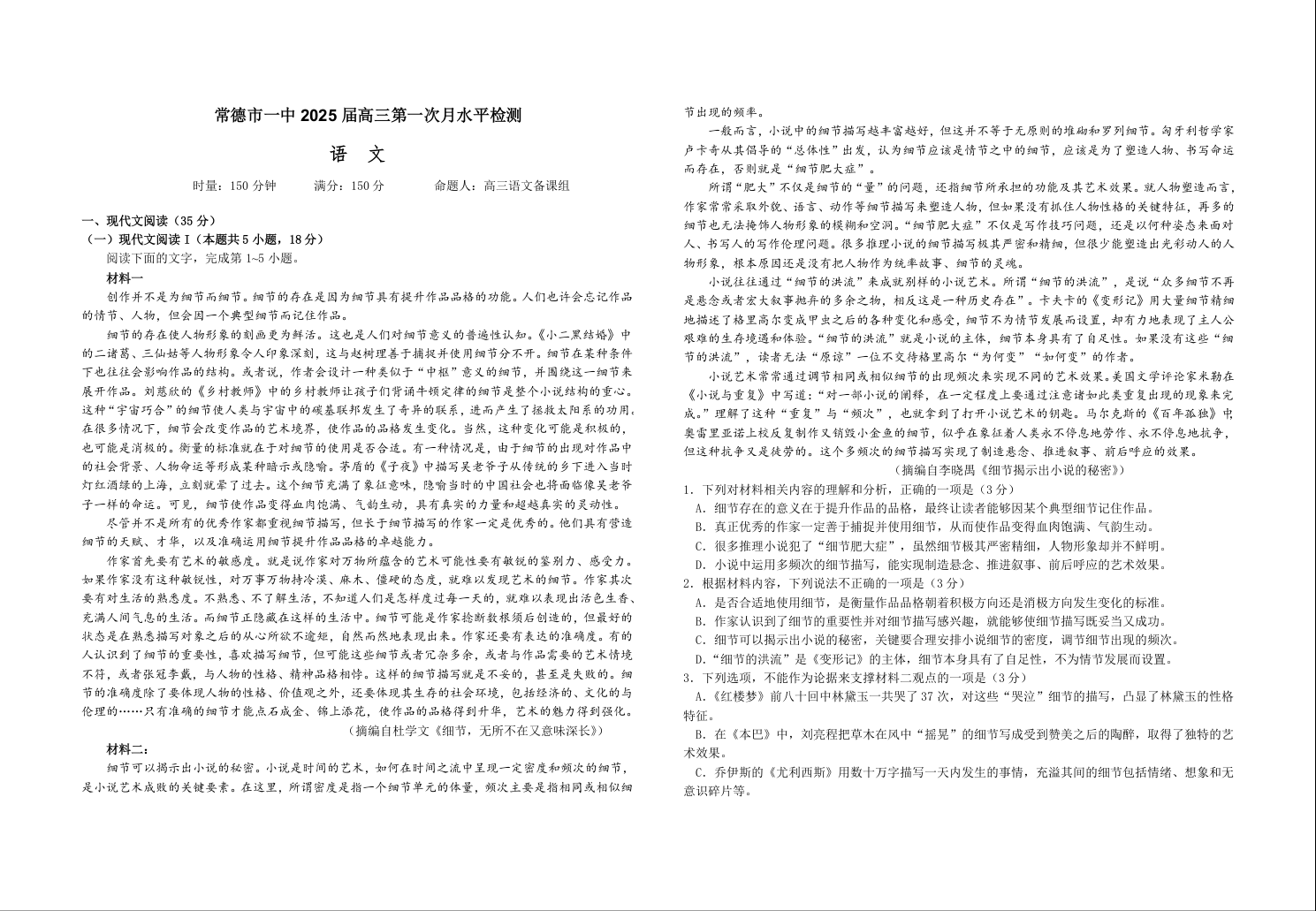 常德市一中2025届高三第一次月水平检测 语文