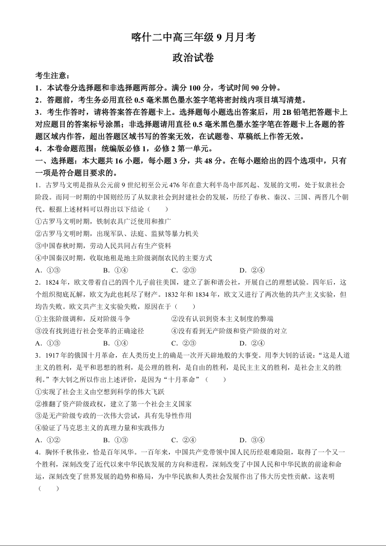 新疆维吾尔自治区喀什第二中学2025届高三9月月考 政治