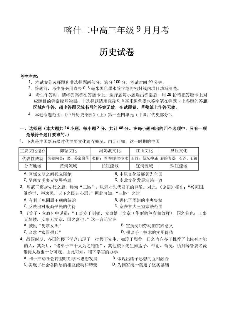 新疆维吾尔自治区喀什第二中学2025届高三9月月考 历史