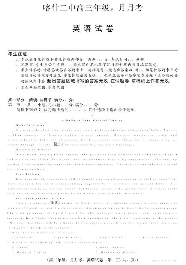 新疆维吾尔自治区喀什第二中学2025届高三9月月考 英语