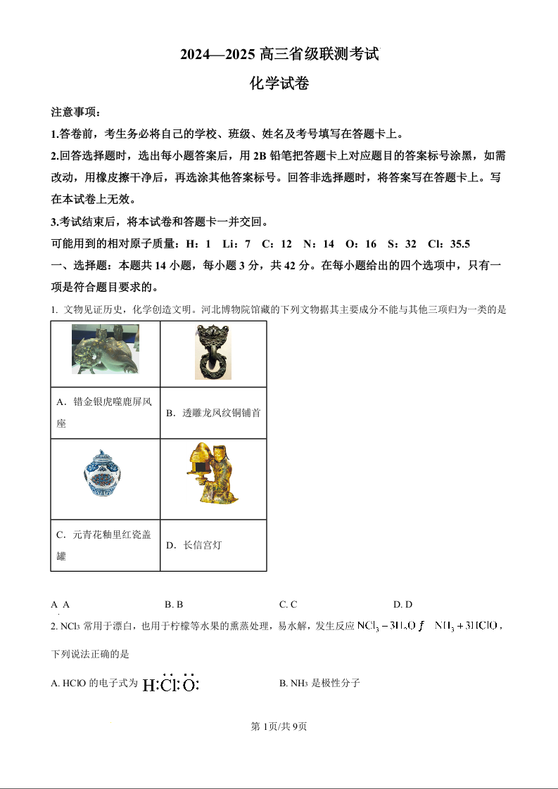 河北省2024-2025学年高三省级联测考试 化学