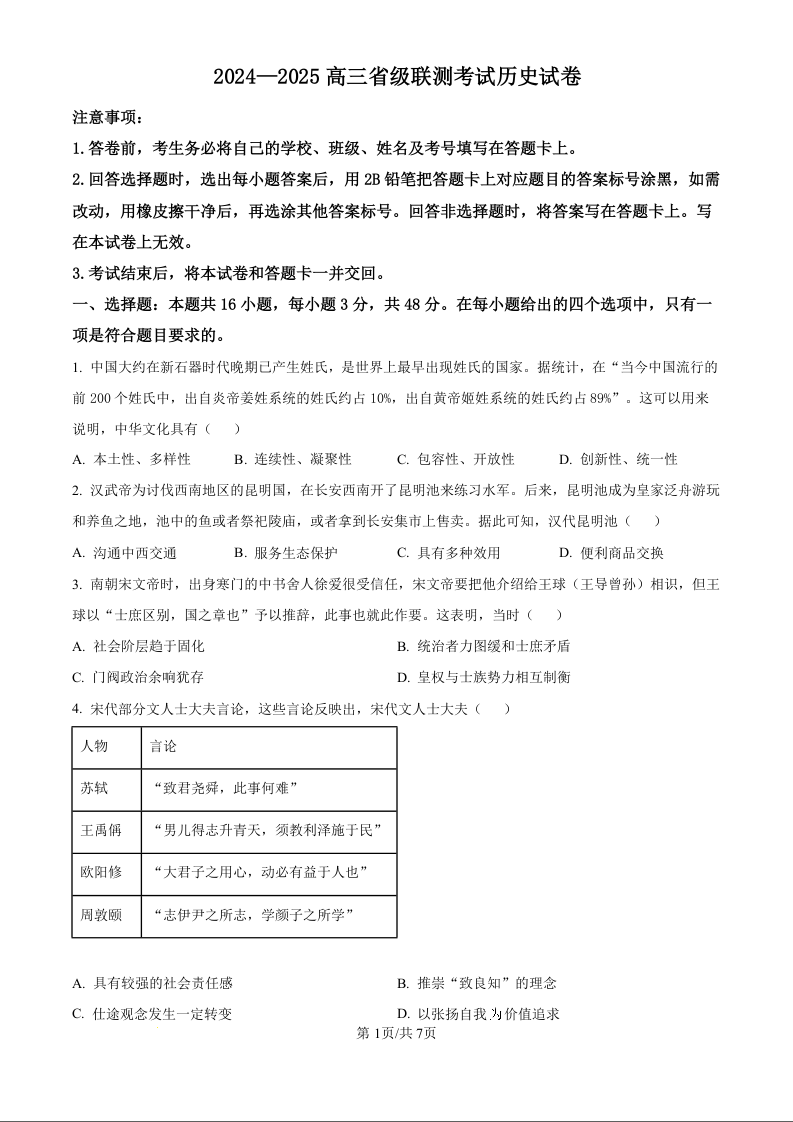 河北省2024-2025学年高三省级联测考试 历史