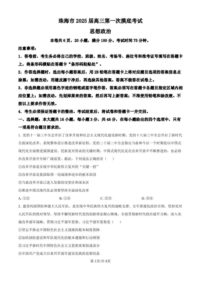 广东省珠海市2024-2025学年高三上学期第一次摸底考试 政治