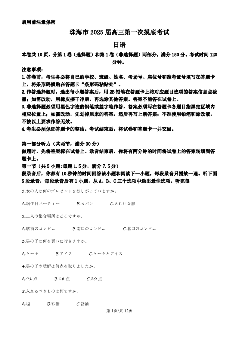 广东省珠海市2024-2025学年高三上学期第一次摸底考试 日语