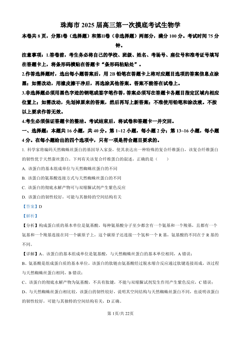 广东省珠海市2024-2025学年高三上学期第一次摸底考试 生物答案