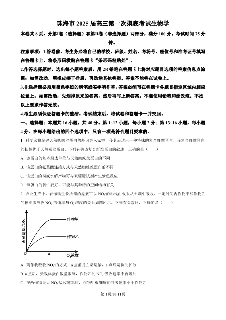 广东省珠海市2024-2025学年高三上学期第一次摸底考试 生物