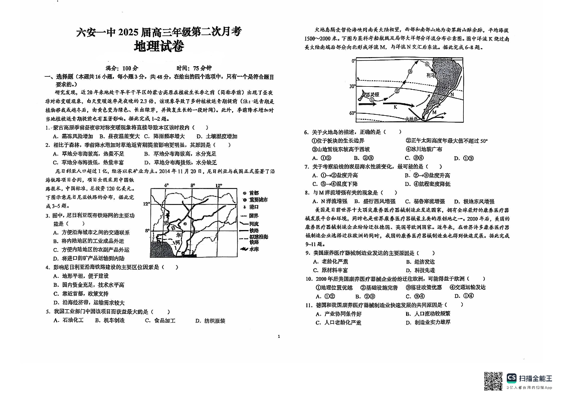 安徽省六安第一中学2024-2025学年高三上学期9月月考 地理
