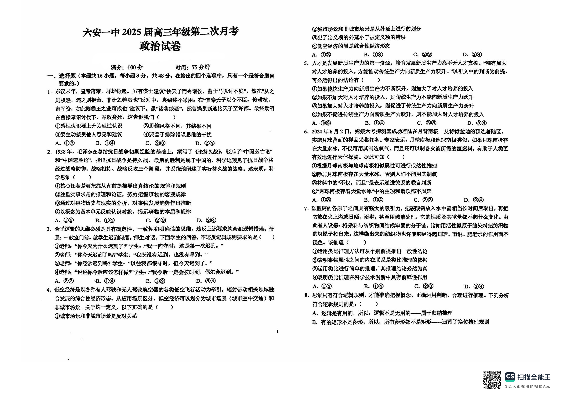 安徽省六安第一中学2024-2025学年高三上学期9月月考 政治