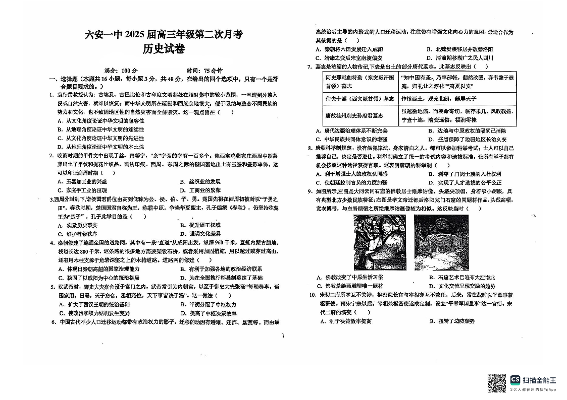 安徽省六安第一中学2024-2025学年高三上学期9月月考 历史