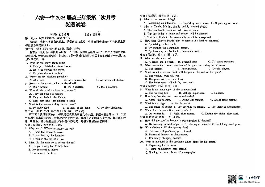 安徽省六安第一中学2024-2025学年高三上学期9月月考 英语