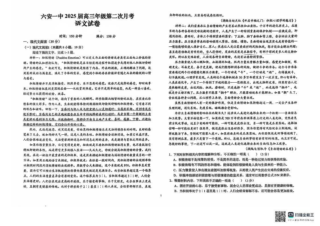 安徽省六安第一中学2024-2025学年高三上学期9月月考 语文