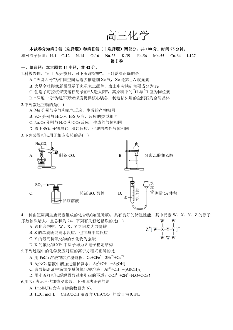 四川省成都列五中学2024-2025学年高三上学期9月月考 化学