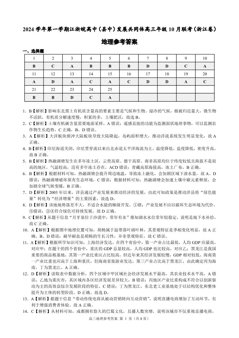 江浙皖高中(县中)发展共同体2024-2025学年高三上学期10月联考 地理答案