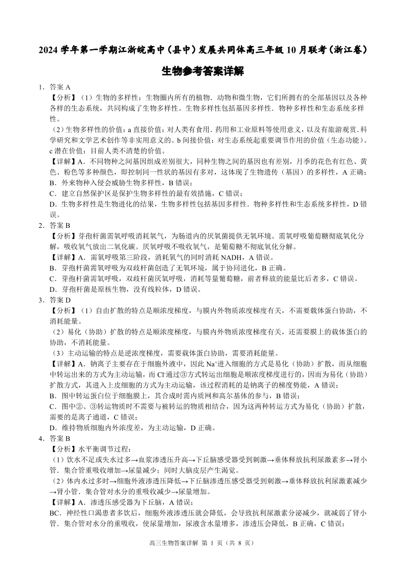 江浙皖高中(县中)发展共同体2024-2025学年高三上学期10月联考 生物答案