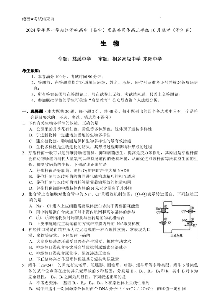 江浙皖高中(县中)发展共同体2024-2025学年高三上学期10月联考 生物