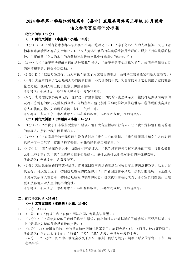 江浙皖高中(县中)发展共同体2024-2025学年高三上学期10月联考 语文答案