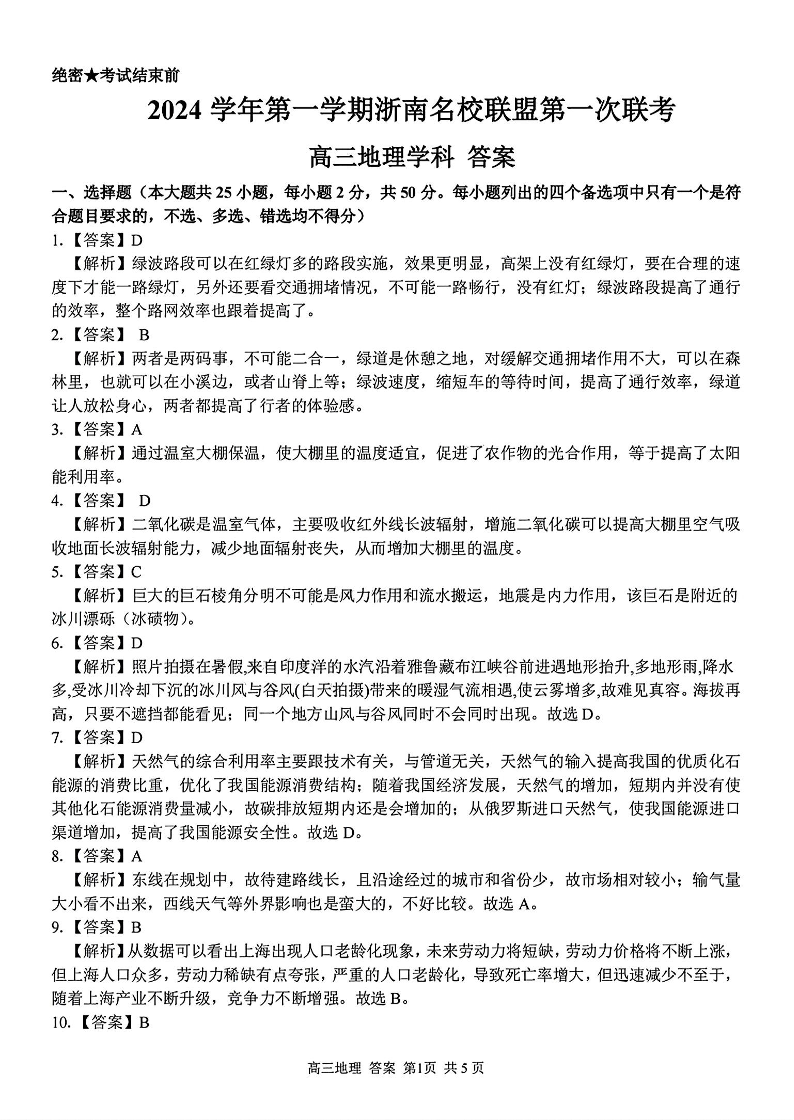 2024学年第一学期浙南名校联盟高三第一次联考 地理答案