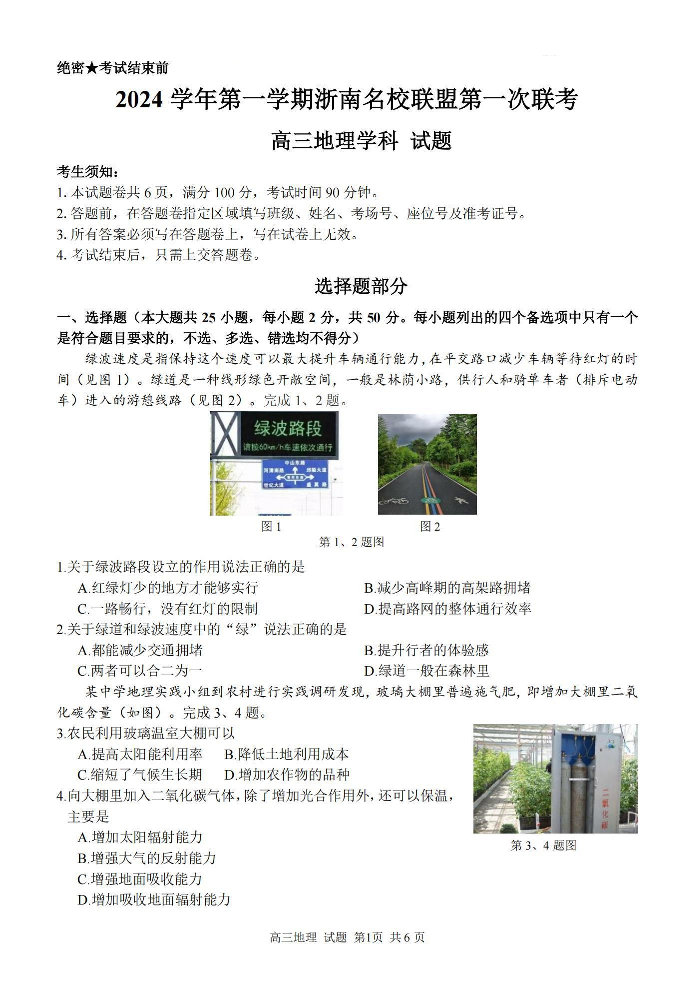 2024学年第一学期浙南名校联盟高三第一次联考 地理
