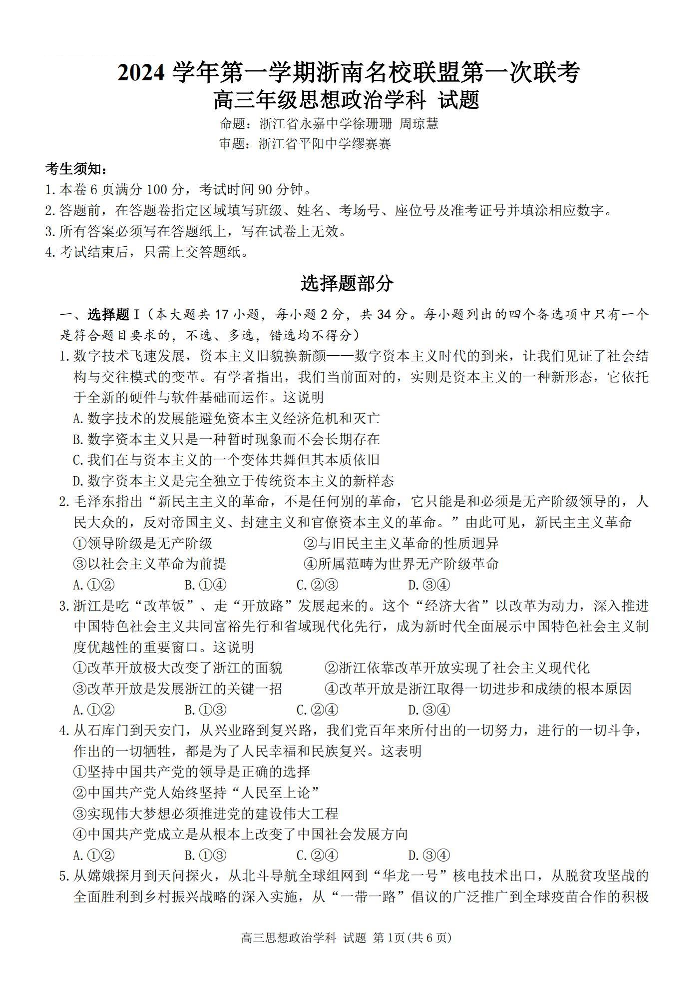 2024学年第一学期浙南名校联盟高三第一次联考 政治