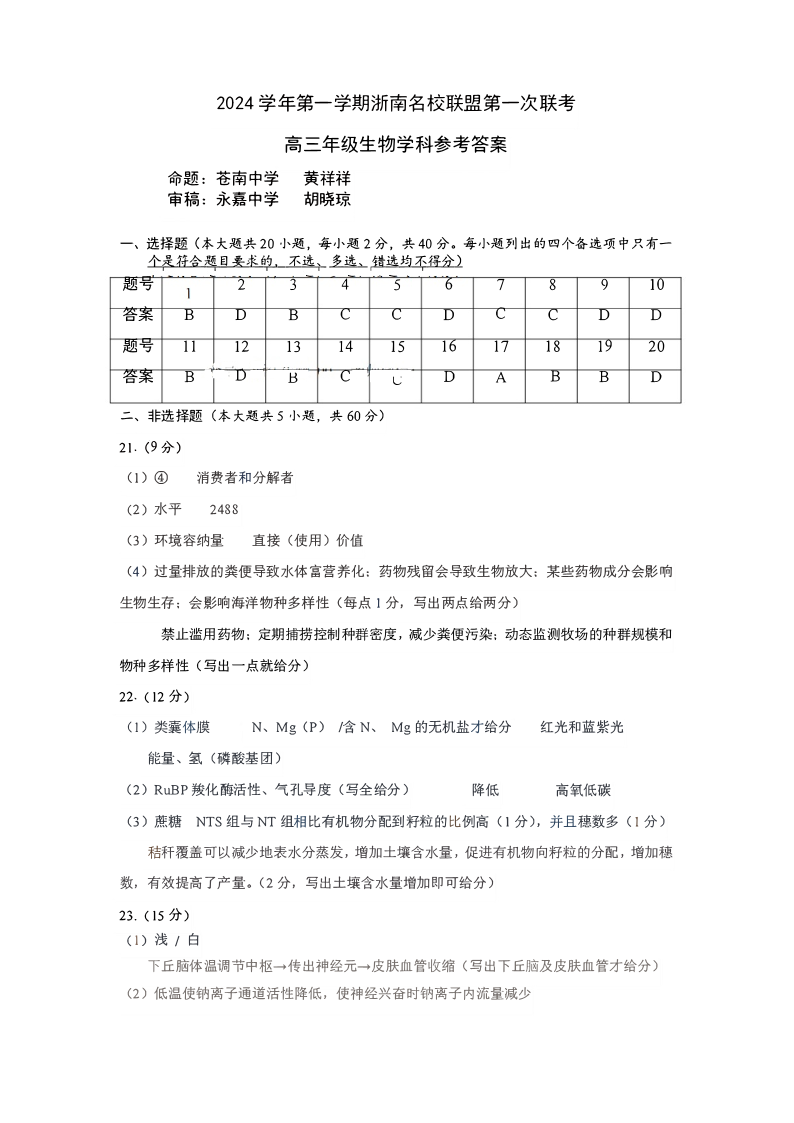 2024学年第一学期浙南名校联盟高三第一次联考 生物答案
