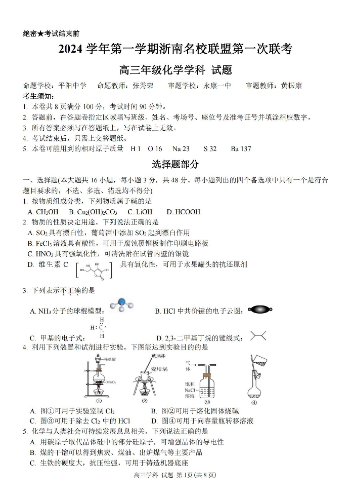 2024学年第一学期浙南名校联盟高三第一次联考 化学