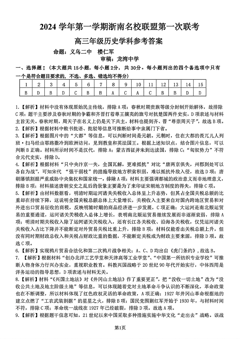 2024学年第一学期浙南名校联盟高三第一次联考 历史答案