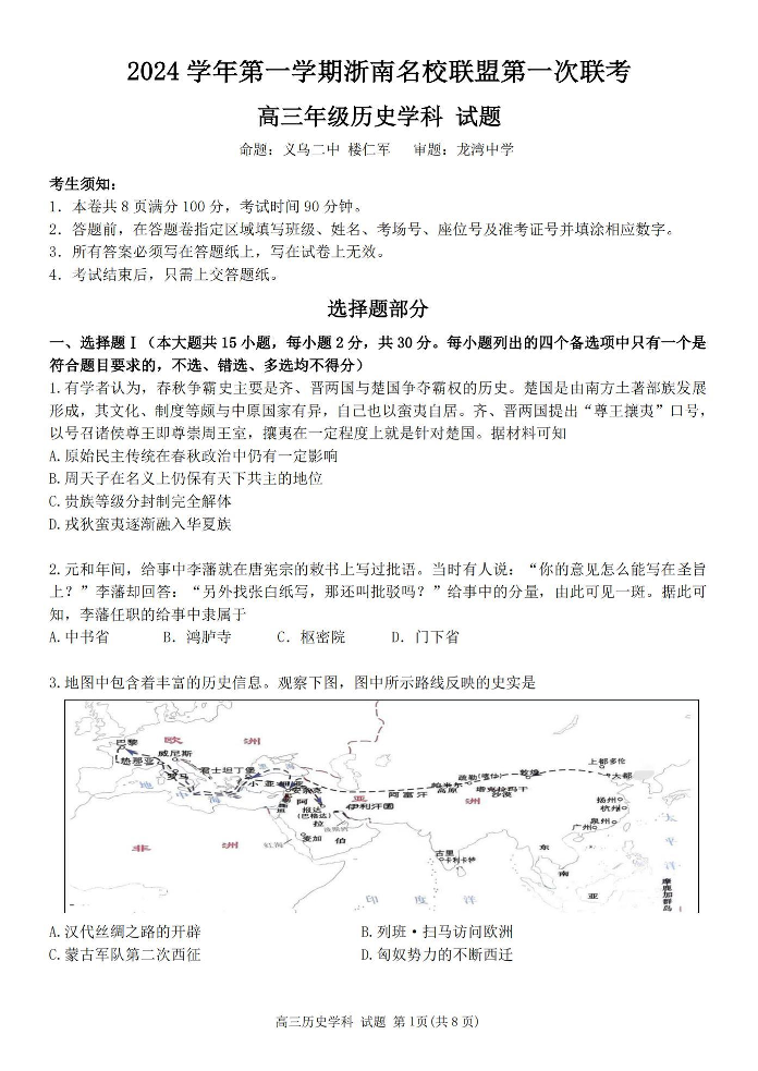 2024学年第一学期浙南名校联盟高三第一次联考 历史