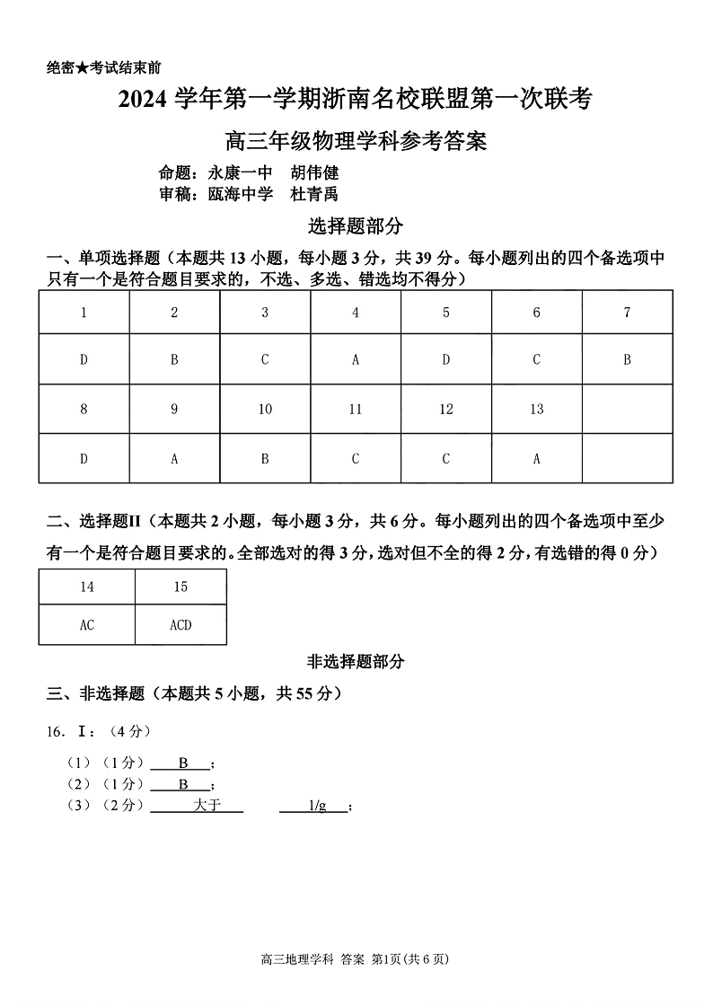 2024学年第一学期浙南名校联盟高三第一次联考 物理答案