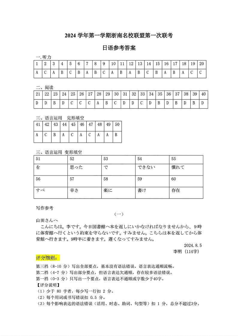 2024学年第一学期浙南名校联盟高三第一次联考 日语答案