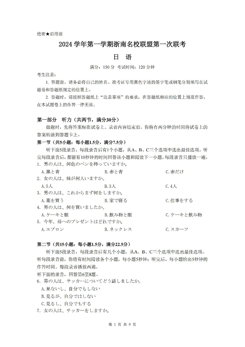 2024学年第一学期浙南名校联盟高三第一次联考 日语