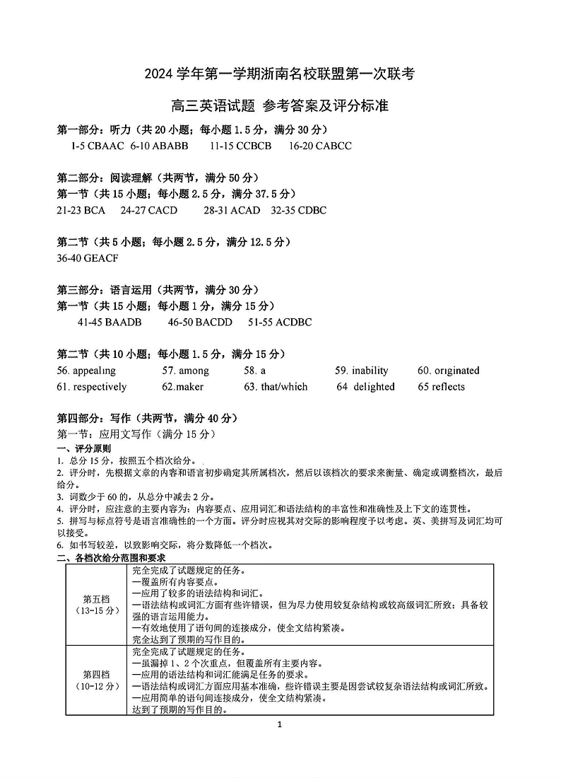 2024学年第一学期浙南名校联盟高三第一次联考 英语答案