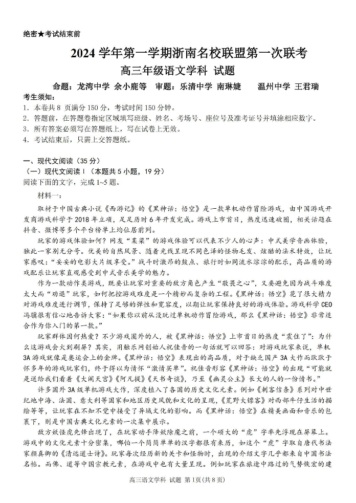 2024学年第一学期浙南名校联盟高三第一次联考 语文