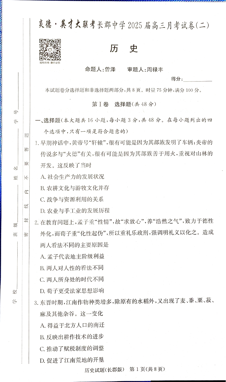 湖南省长沙市长郡中学2025届高三上学期月考(二)历史