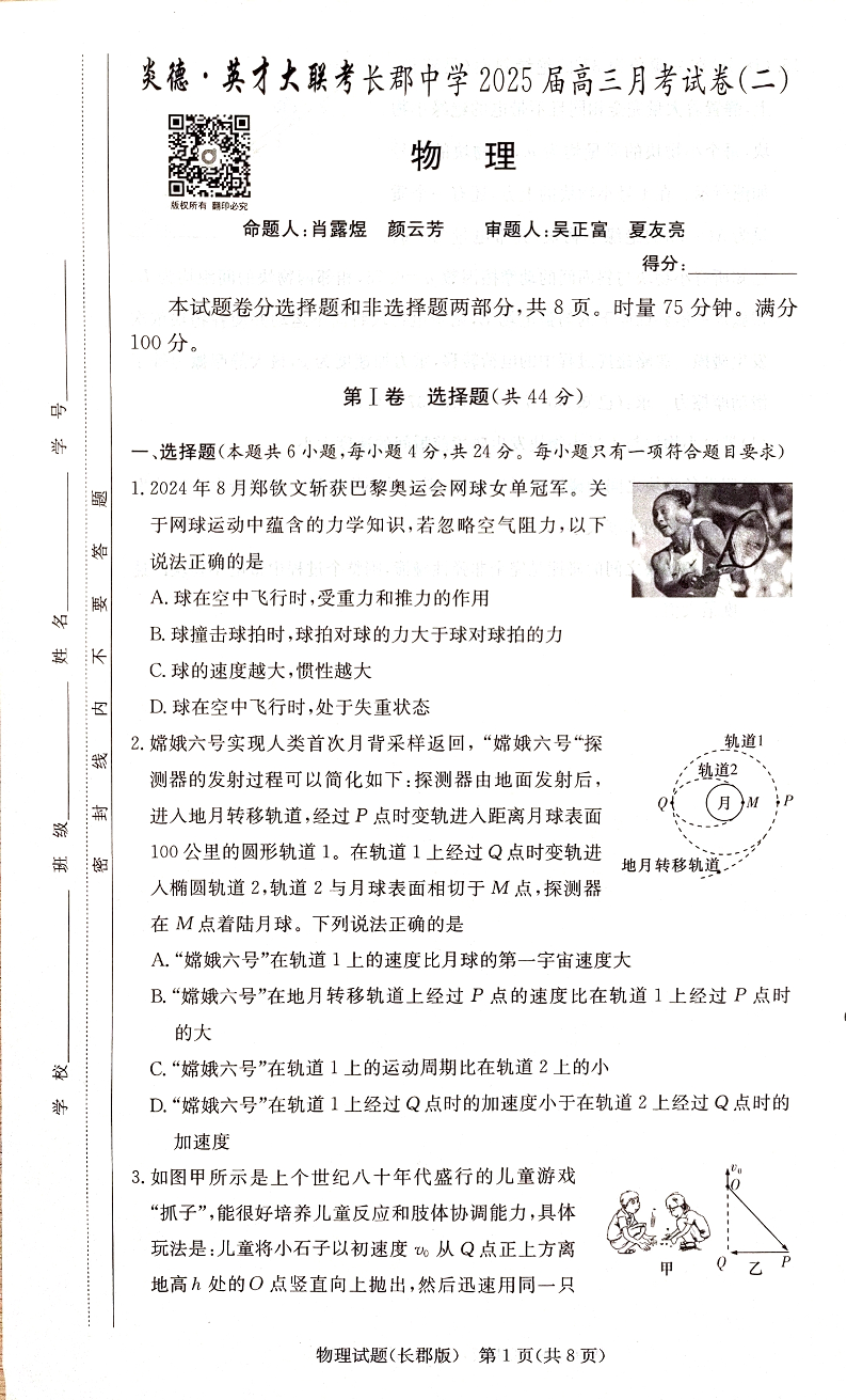 湖南省长沙市长郡中学2025届高三上学期月考(二)物理