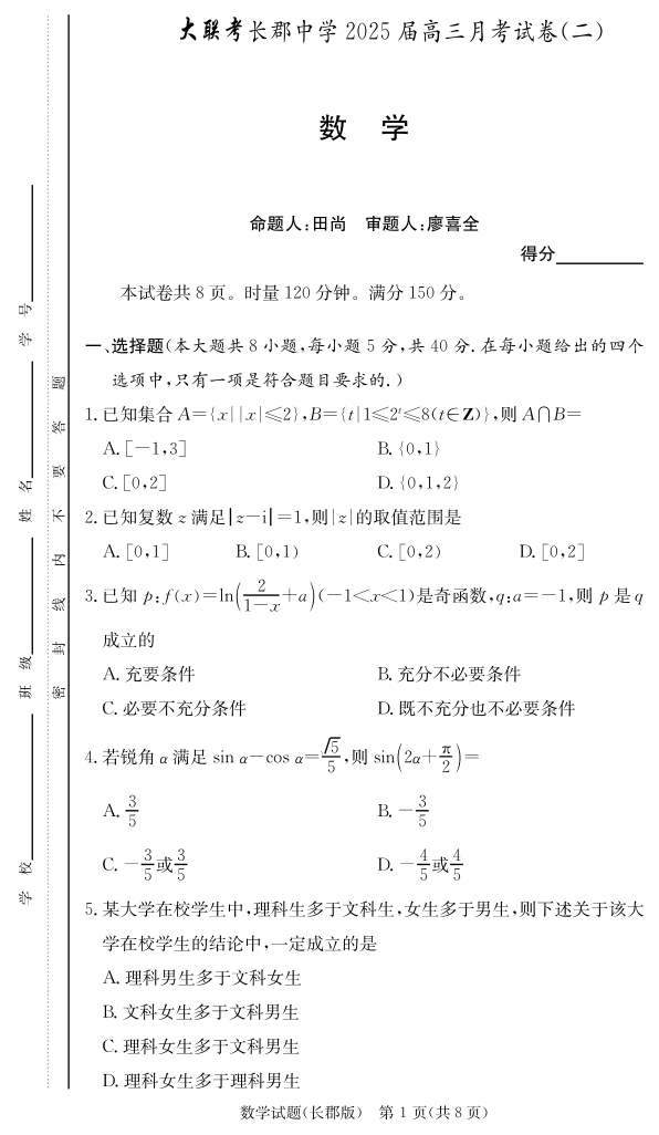 湖南省长沙市长郡中学2025届高三上学期月考(二)数学