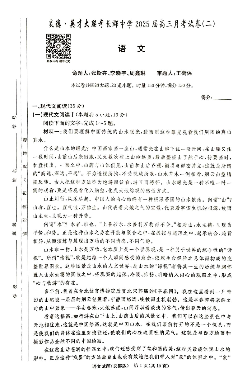 湖南省长沙市长郡中学2025届高三上学期月考(二)语文