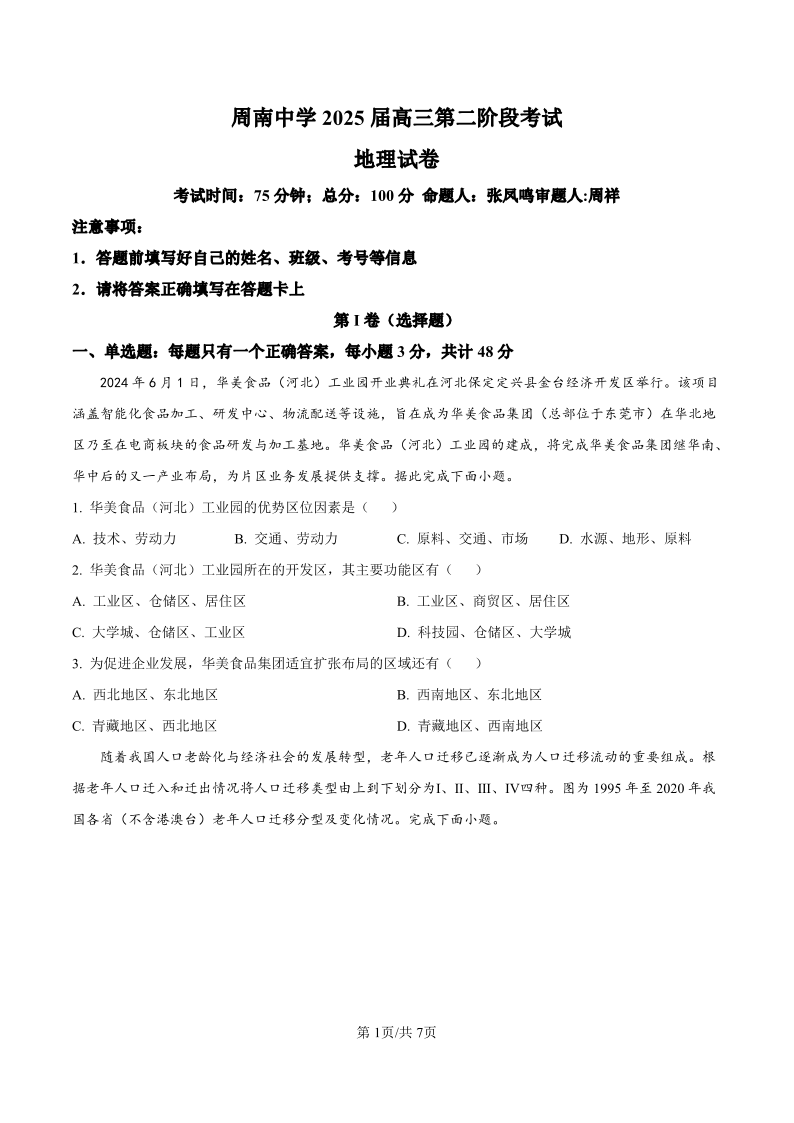 湖南省长沙市周南中学2025届高三上学期第二阶段考试 地理