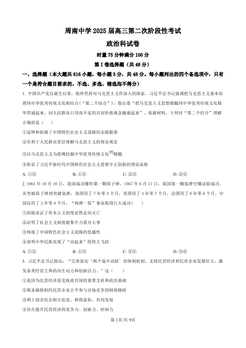 湖南省长沙市周南中学2025届高三上学期第二阶段考试 政治