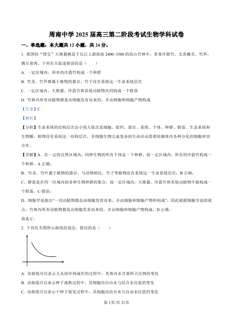 湖南省长沙市周南中学2025届高三上学期第二阶段考试 生物答案