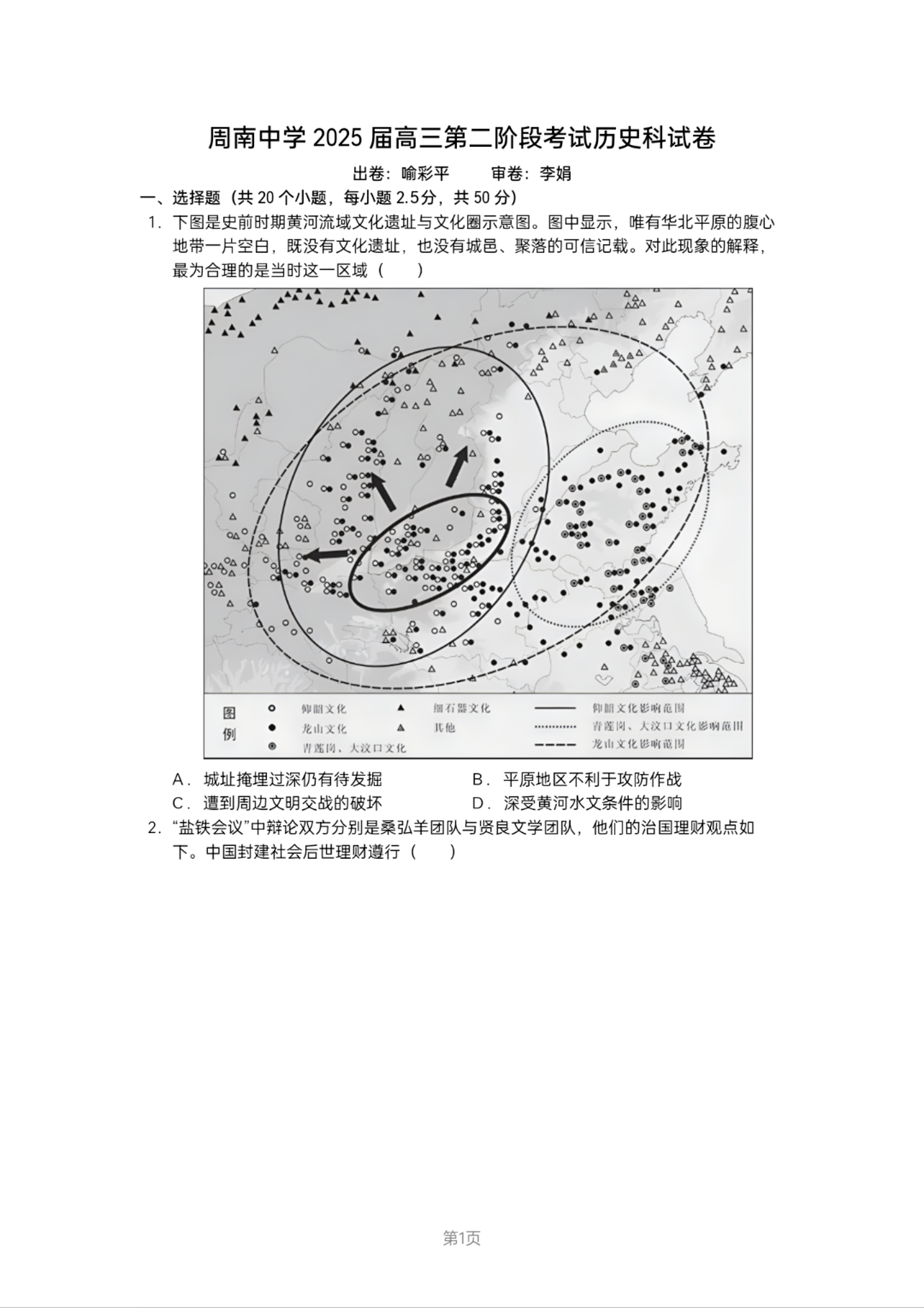 湖南省长沙市周南中学2025届高三上学期第二阶段考试 历史